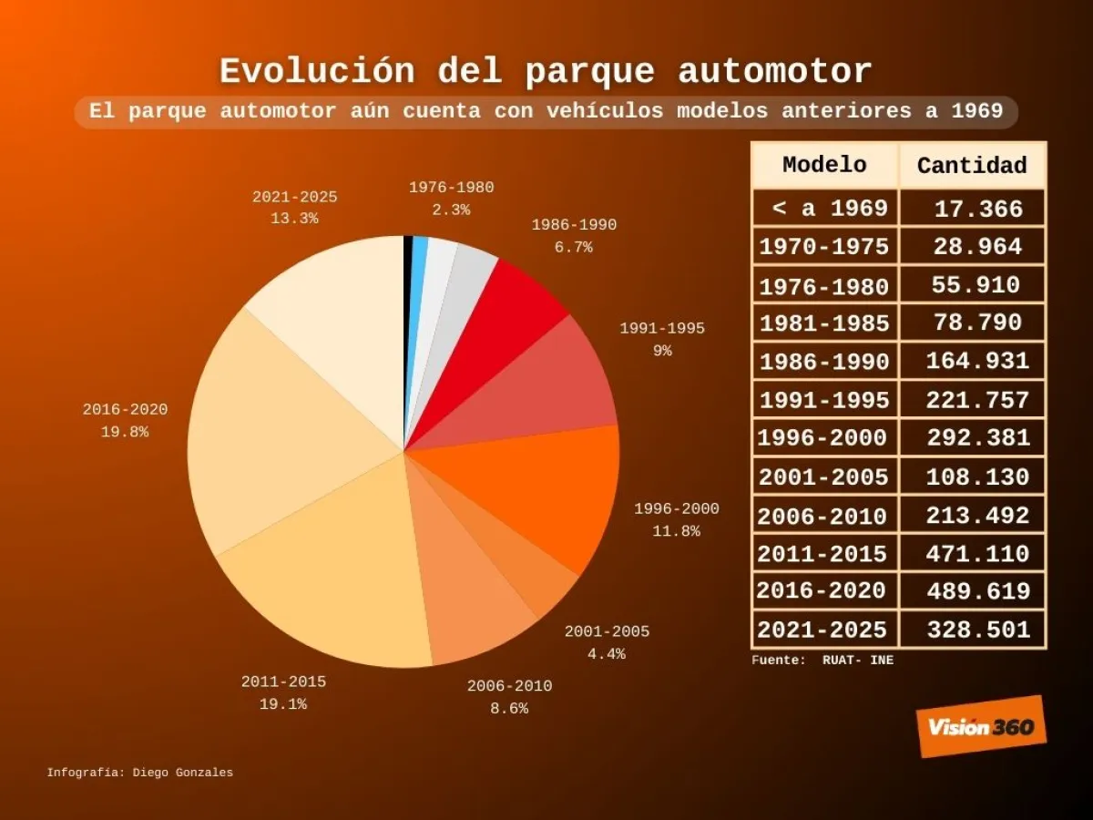 Datos del Registro Único para la Administración Tributaria Municipal (RUAT) y del Instituto Nacional de Estadística (INE), revelan que, hasta 2023, en el país circulaban 17.367 coches fabricados en 1969 (0,7% del parque), 28.634 vehículos son modelos 1970 - 1975 (1,2%); 55.910 tiene una antigüedad de 1976 - 1980 (2,3%); 78.790 son modelos 1981 - 1985 (3,2%); 164.931 datan de 1986 - 1990 (6,7%), 221.757 fueron fabricados entre 1991 y 1995 (9%), y 292.381 de 1996 a 2.000 (11,4%)