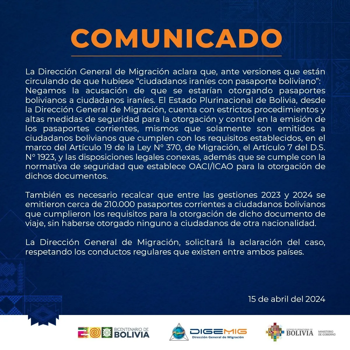 “Negamos la acusación de que se estarían otorgando pasaportes bolivianos a ciudadanos iraníes. (…) La Dirección General de Migración solicitará la aclaración del caso, respetando los conductos regulares que existen entre ambos países”, señala la entidad en un comunicado.