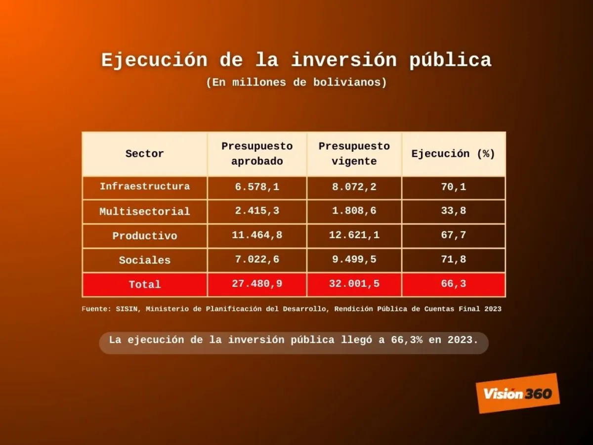 El presidente del Colegio de Economistas de Tarija, Fernando Romero, explicó que, según los últimos datos del Ministerio de Planificación del Desarrollo, la gestión 2023, el sector público tuvo una ejecución presupuestaria en inversión pública de 18.233 millones, equivalente a unos 2.658 millones de dólares. “La ejecución en inversión pública del 2023 fue apenas mayor en 1% que la de 2022, cuyo monto fue de 2.634 millones de dólares, donde sólo se logró el 52,5% de la meta programada (5.015 millones de dólares)”, precisó.