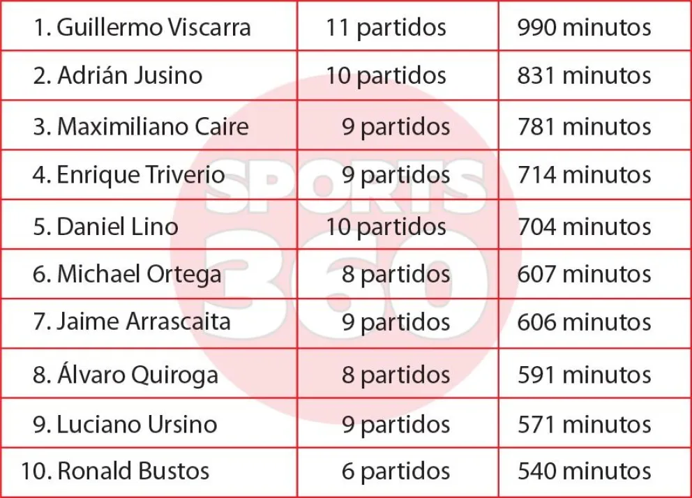 Además de Viscarra, que ocupa el primer lugar en presencias y también en minutos jugados, los 10 futbolistas atigrados que más minutos suman en lo que va de la temporada son: