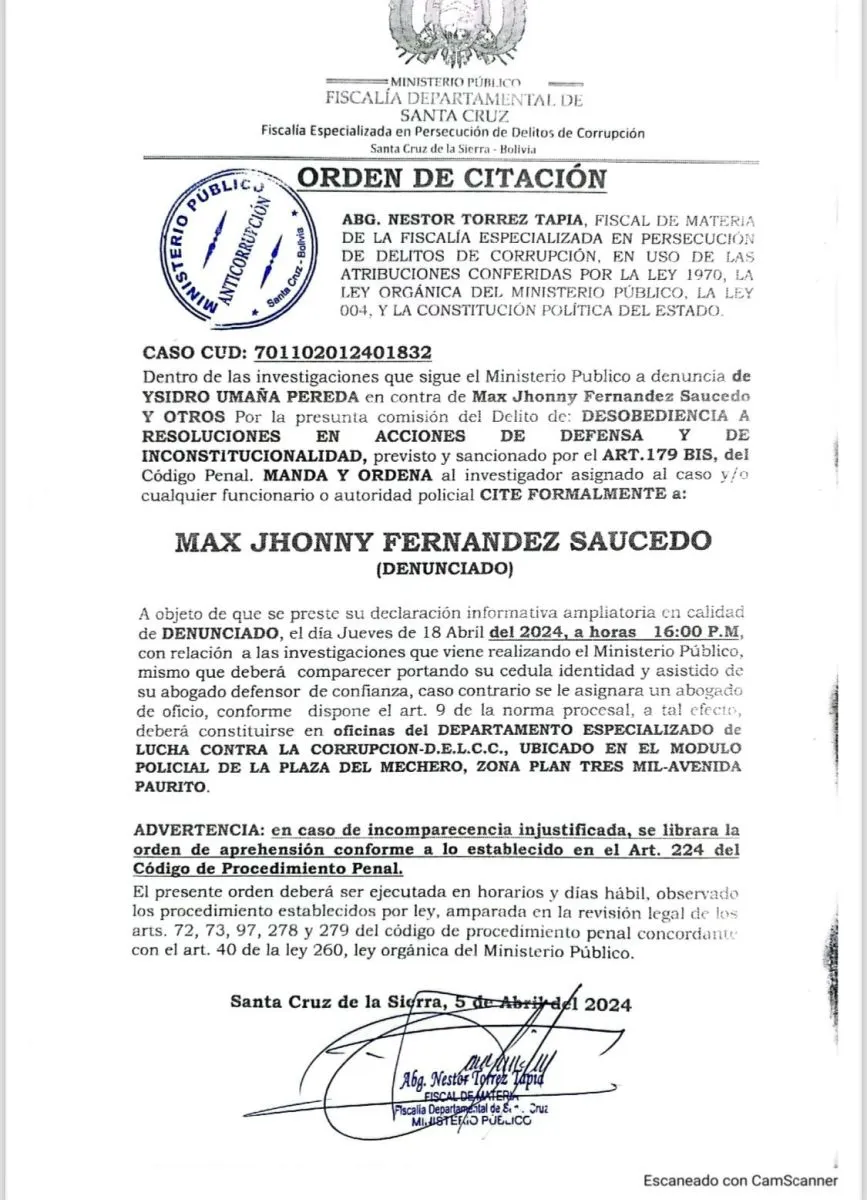 El alcalde de Santa Cruz, Jhonny Fernández, fue citado a declarar por la Fiscalía de esa ciudad “por el presunto delito de desobediencia a resoluciones en acciones de defensa y de inconstitucionalidad”.