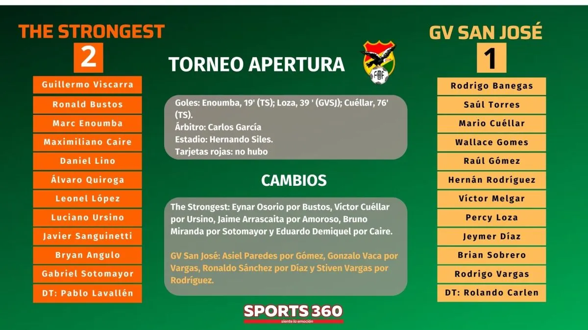 The Strongest avanzó a las semifinales del torneo Apertura, no falló a las previsiones, pero sufrió más de la cuenta para ganarle a GV San José por 2 a 1, en el partido de ida de los cuartos de final, que se jugó en la noche de este miércoles en el estadio Hernando Siles.