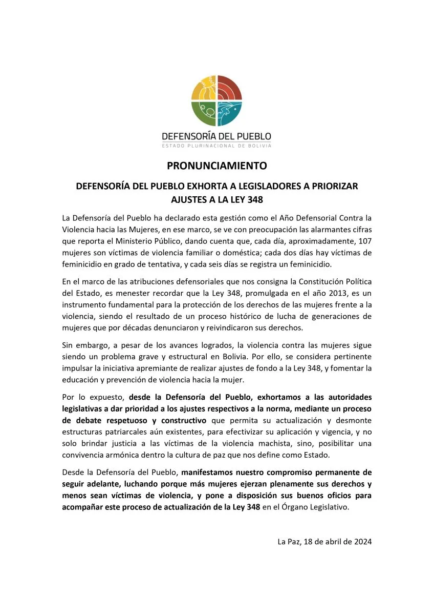 “Desde la Defensoría del Pueblo exhortamos a las autoridades legislativas a dar prioridad a los ajustes respectivos a la norma, mediante un proceso de debate respetuoso y constructivo que permita su actualización y desmonte estructuras patriarcales aún existentes, para efectivizar su aplicación y vigencia, y no solo brindar justicia a las víctimas de la violencia machista, sino, posibilitar una convivencia armónica dentro la cultura de paz que nos define como Estado”, dice la entidad en un comunicado.