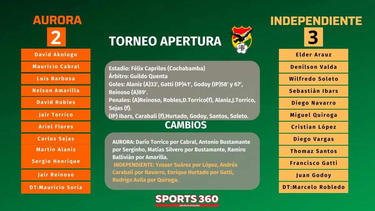 En los penales falló Aurora dos remates (Darío Torrico y Sejas), anotaron: Reinoso, Robles, Alaniz y Jair Torrico; en Independiente falló Carabalí, acertaron Ibars, Hurtado, Godoy, Santos y Soleto.