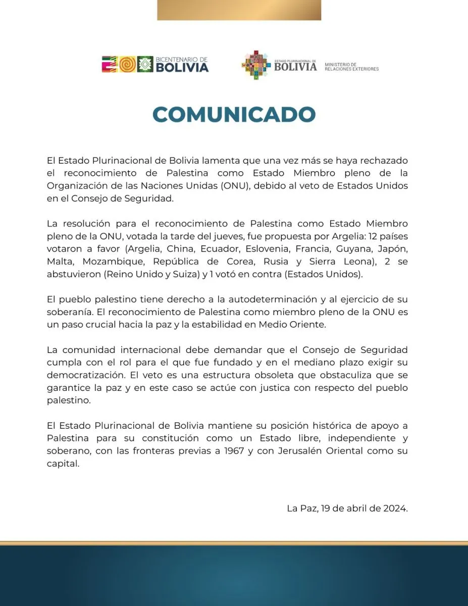 “El pueblo palestino tiene derecho a la autodeterminación y al ejercicio de su soberanía. El reconocimiento de Palestina como miembro pleno de la ONU es un paso crucial hacia la paz y la estabilidad en Medio Oriente”, se lee en el pronunciamiento de la Cancillería de Bolivia.