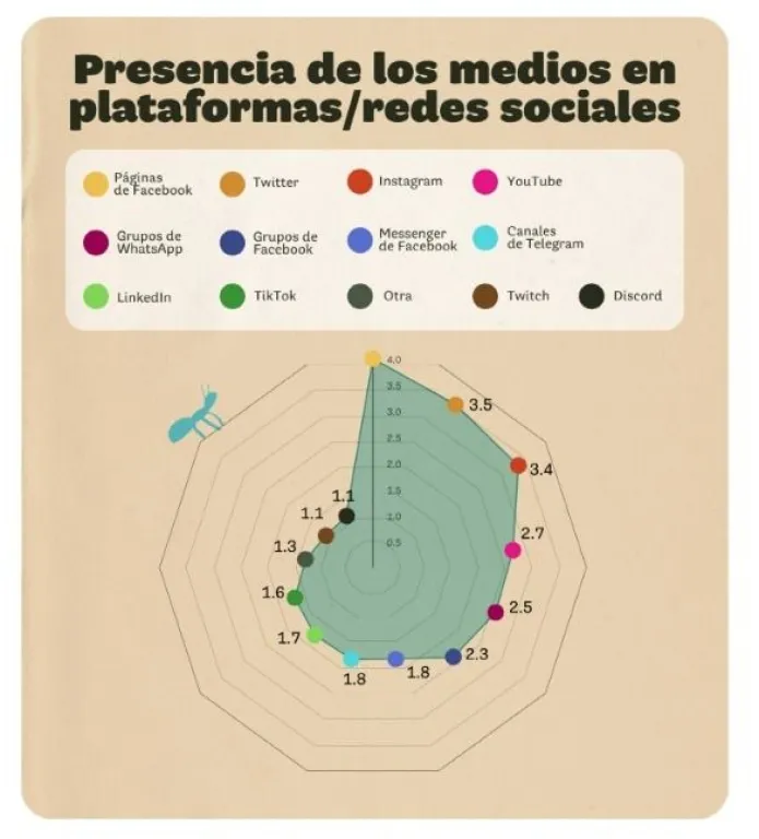 Para los medios bolivianos también es importante, aunque en mucha menos proporción, el uso de redes como grupos de WhatsApp, grupos en Facebook, Messenger, Linkedin y TikTok. Sin embargo, debido a que esta encuesnta se realizó hace casi dos años, es posible que las tendencias haya tenido alguna variación, en especial en esta última red social.