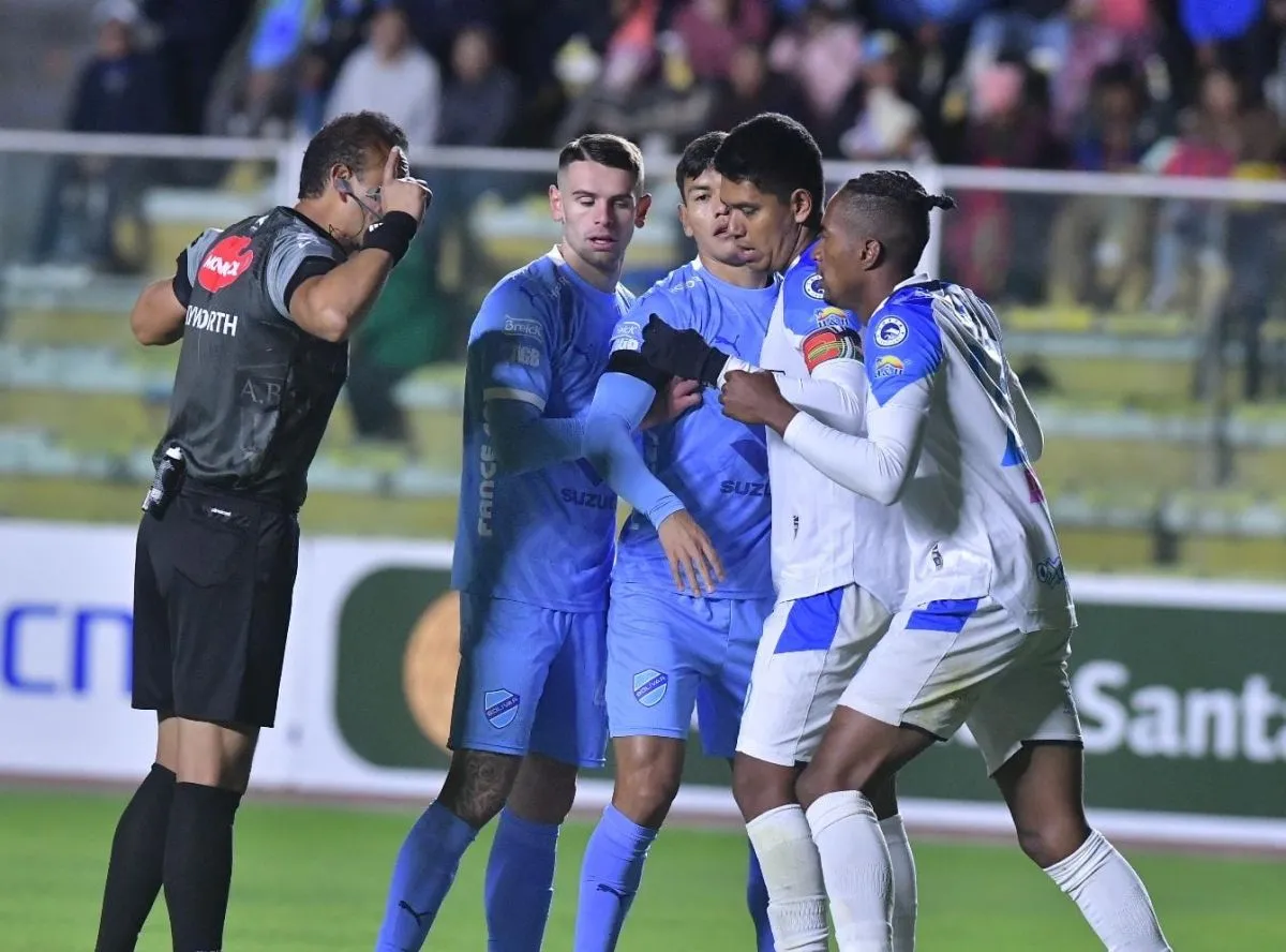 Jugadores de FC Universitario y The Strongest reclaman al árbitro Javier Revollo por un cobro. Foto: APG.