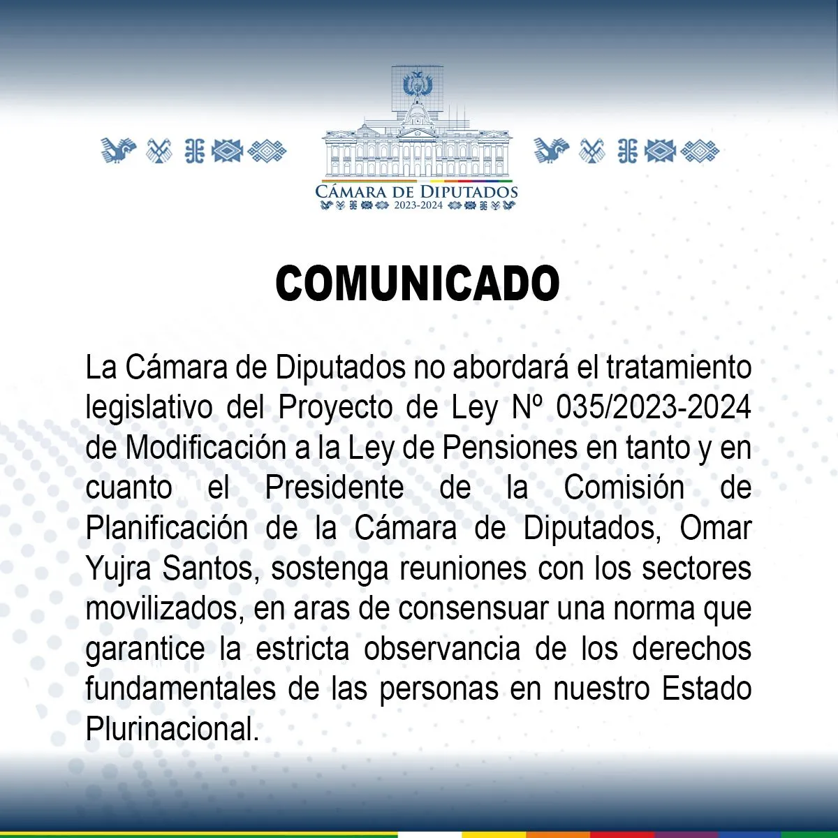 El sábado 20 de abril, la Cámara de Diputados emitió un comunicado en el que señala que esta instancia no abordará el tratamiento de la Ley  035 de Modificación a la Ley de Pensiones. El proyecto de ley, entre sus disposiciones, mantiene la edad de jubilación mínima a los 58 años, pero señala que los trabajadores, al llegar a los 65, deben someterse a un examen médico para seguir trabajando.