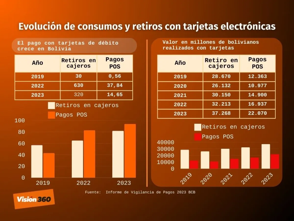 De acuerdo con el informe del BCB, a partir de 2020, las tarjetas se han orientado de manera creciente a los pagos por encima del retiro de dinero en efectivo en cajeros automáticos. Esto por la ampliación de los establecimientos y comercios que aceptan pagos con este instrumento, transacciones por internet, comercio electrónico y la interoperabilidad con billetera móvil.