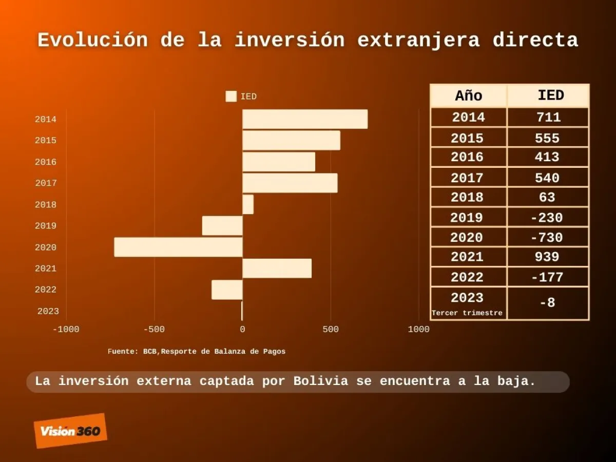 Hasta el tercer trimestre, el flujo de inversión extranjera directa hacía Bolivia fue negativa en -8 millones de dólares, y en 2022 de –177 millones de dólares, luego de que en 2021 se registrara una recuperación con la llegada de 393 millones de dólares de inversión neta (diferencia entre inversión bruta y desinversión).