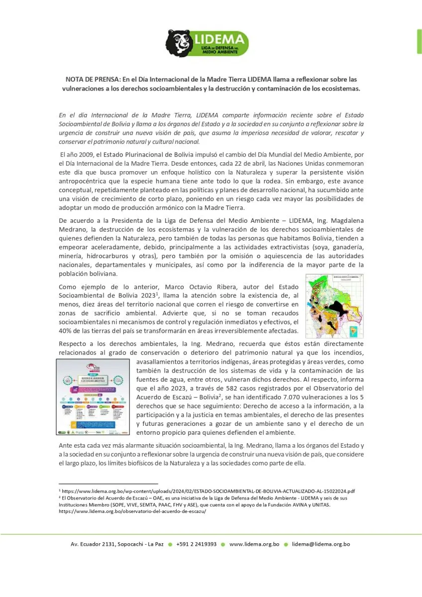 Durante 2023 fueron identificadas 7.070 vulneraciones a cinco derechos de la Madre Tierra en Bolivia, informó Lidema (Liga de Defensa del Medio Ambiente). Este reporte se realiza a través de 582 casos registrados por el Observatorio del Acuerdo de Escazú – Bolivia
