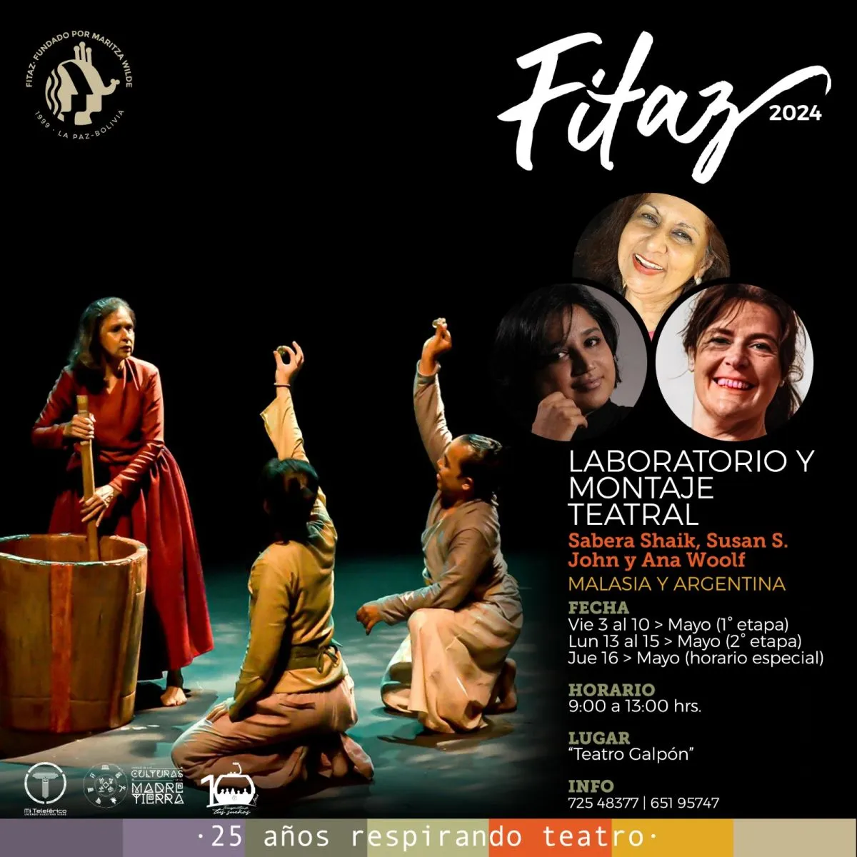 Uno de los talleres más importantes es Laboratorio y montaje teatral, que será dirigido por las artistas malayas Sabera Shaik y Susan Sarah John y la argentina Ana Woolf. Se realizará entre el 3 y el 15 de mayo en el Teatro Galpón, del Parque de las Culturas y de la Madre Tierra (avenida Perú). La característica del curso es que, a su conclusión, los participantes presentarán  una puesta en escena en el Teatro Doña Albina (avenida Ecuador casi Rosendo Gutiérrez).