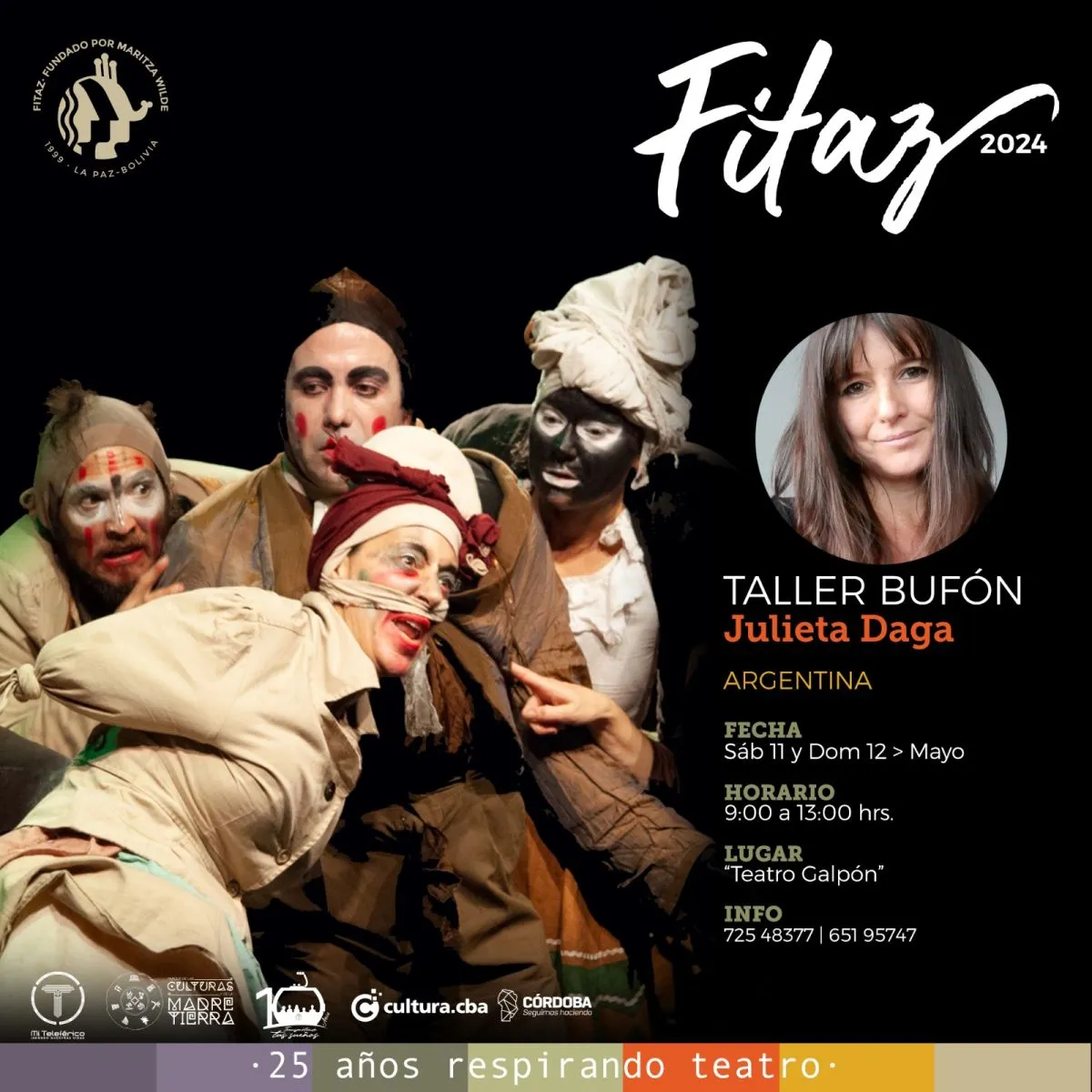 El Taller de bufón, dictado por Julieta Daga (Argentina), será el sábado 11 y el domingo 12 de mayo, de 09.00 a 13.00 en el Teatro Galpón del Parque de las Culturas y de la Madre Tierra. Consiste en indagar en las posibilidades expresivas de cada participante en relación a la oratoria, lo poético y blasfemo. Se ejercita la rapidez imaginativa, la burla, la destreza corporal en términos performáticos a través de la construcción de dispositivos y vestuarios. La dinámica es a través de juegos colectivos que permiten trabajar la noción de coro y corifeo.