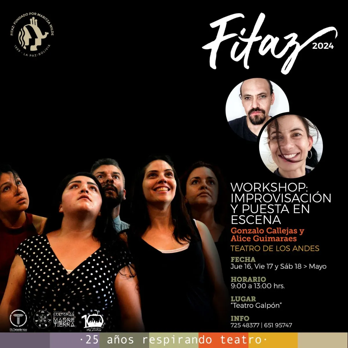 Asimismo, se tendrá Workshop de improvisación y puesta en escena, dirigido por Gonzalo Callejas y Alice Guimaraes (Teatro de Los Andes). Ocurrirá los días jueves 16, viernes 17 y sábado 18 de mayo, de 09.00 a 13.00 en el Teatro Galpón. Teatro de los Andes utiliza improvisación y construcción de imágenes escénicas como un disparador creativo, en la elaboración de sus obras. El objetivo de este taller es hacer conocer y practicar la metodología de creación, desarrollada por Teatro de Los Andes en 30 años.
