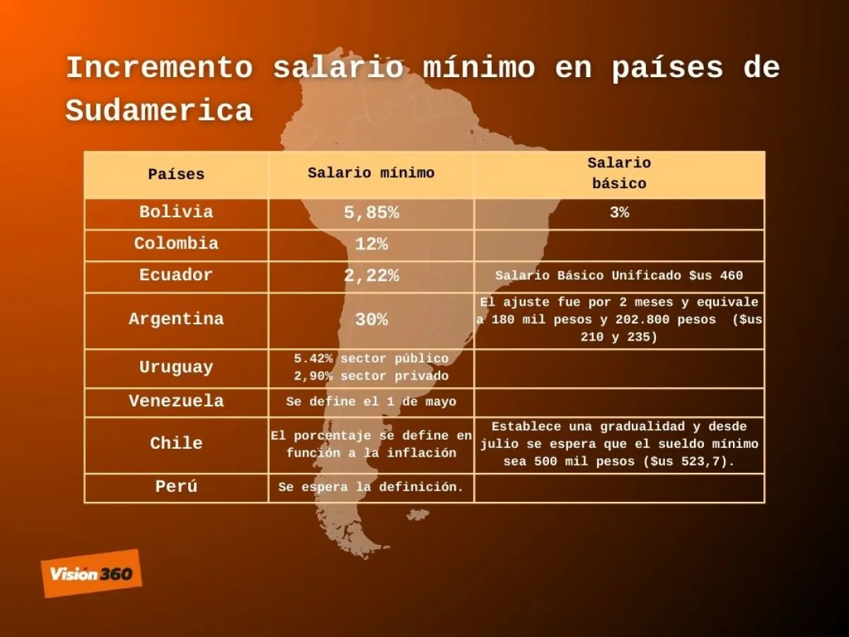 ¿Cuánto fue el incremento al salario mínimo en países de Sudamérica? En algunos países como Venezuela el salario se mantiene sin variación, mientras que el mayor incremento fue en Colombia, del 12%.