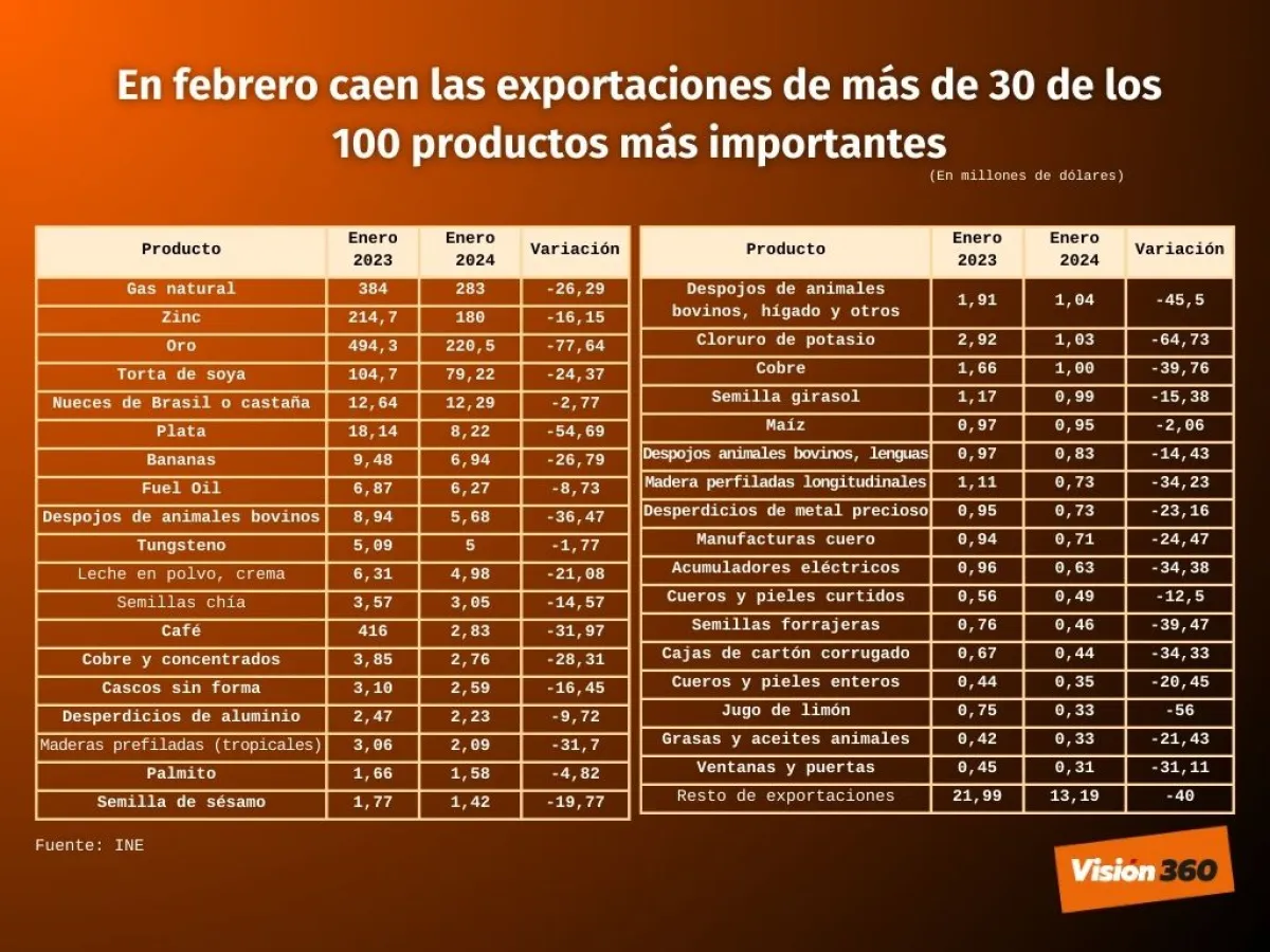 Más de una treintena de los principales productos de exportación de Bolivia al mundo sufrieron una caída entre enero y febrero, mientras que el déficit comercial aumentó y las ventas totales del país disminuyeron en 23%, según datos el Instituto Nacional de Estadística (INE).