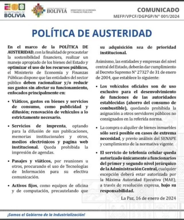 “... El Ministerio de Economía y Finanzas Públicas dispone que las entidades del sector público deben racionalizar y/o reducir sus gastos sin afectar su funcionamiento, enfocados principalmente en: (...) Servicios de imprenta, optando para la difusión de sus publicaciones, memorias institucionales y otros, en medios electrónicos y página web institucional. Queda prohibida la impresión de agendas…”, señala el Comunicado MEFP/VPCF/DGPGP/N° 001/2024.