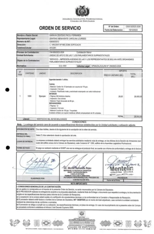 El contrato de dicha Adquisición data del 19 de diciembre de 2023. Detalla que el proveedor deberá entregar 1.000 agendas en siete días calendario luego de la aprobación del arte. El monto total es de 28.000 bolivianos, es decir a 28 bolivianos por cada una. En las especificaciones detalla que tendrán tapas de cartón, 340 páginas con distintos diseños, hojas ahuesadas de 80 gramos.