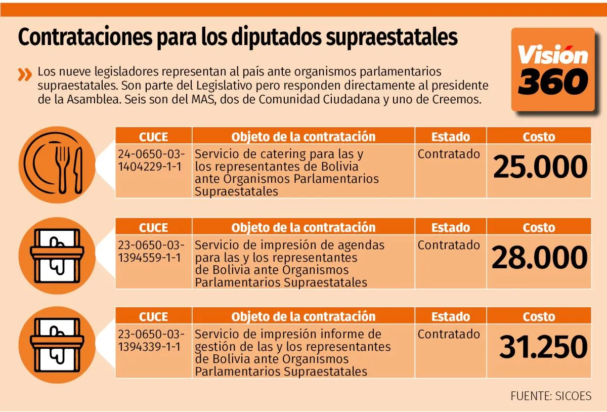El “servicio de catering para las y los representantes de Bolivia ante Organismos Parlamentarios Supraestatales”, tiene un costo de 25.000 bolivianos. Por el contrato se entiende que la ejecución puede ser menor, pero no mayor.