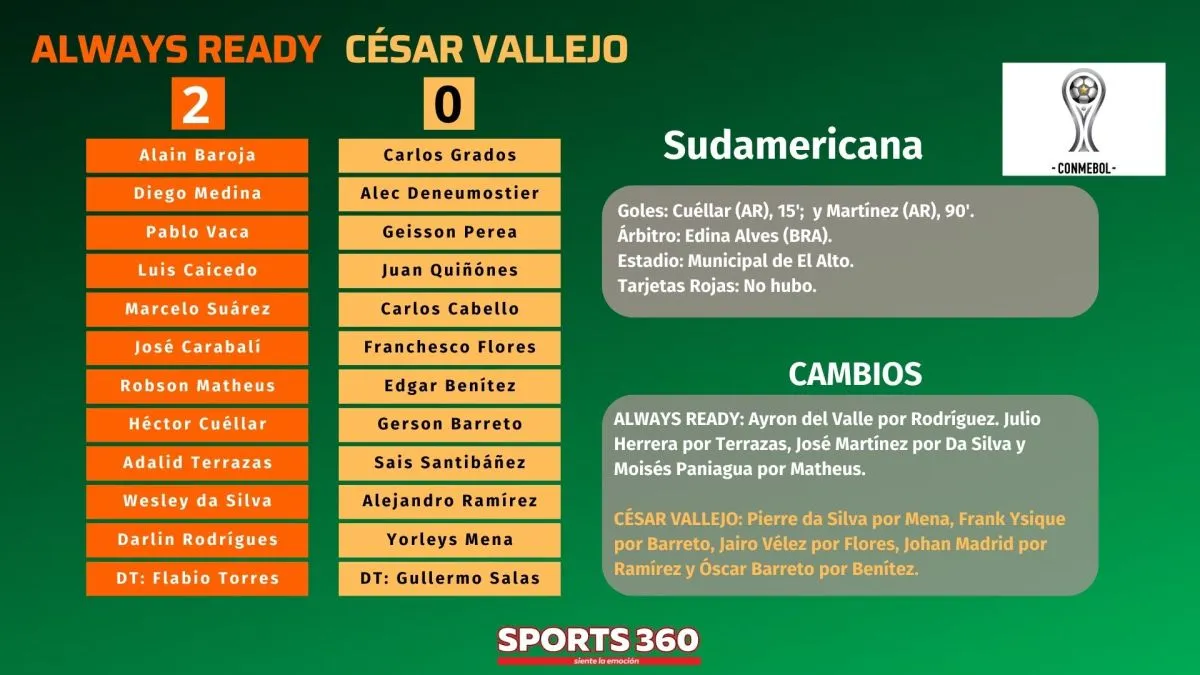Always Ready derrotó al peruano César Vallejo (2-0), que tuvo como figura a su arquero Carlos Grados, y se puso como líder en solitario del Grupo A de la Copa Sudamericana, este jueves en el estadio Municipal de El Alto tras la tercera jornada del torneo internacional.