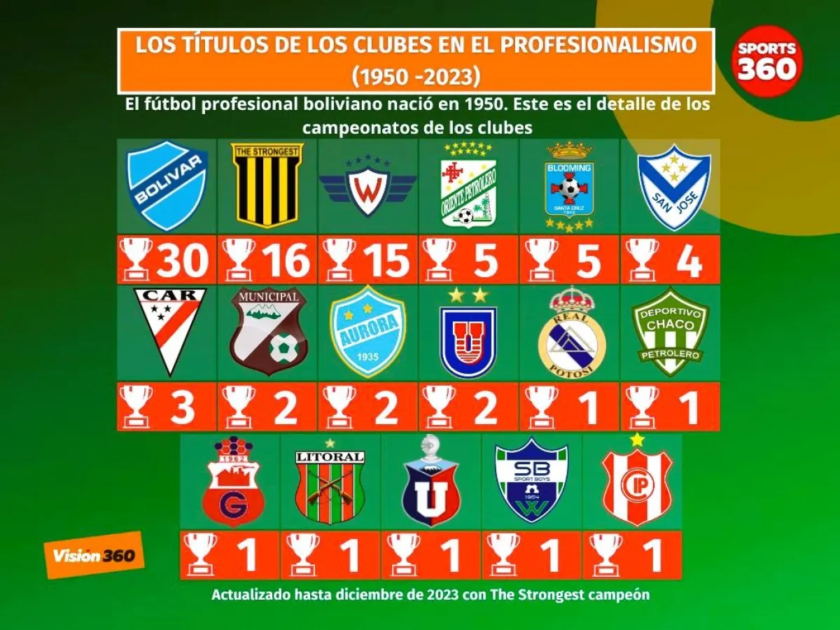 Desde 1950, Bolívar sumó 30 coronas, The Strongest es segundo con 16, la tercera colocación le corresponde a Wilstermann con 15.