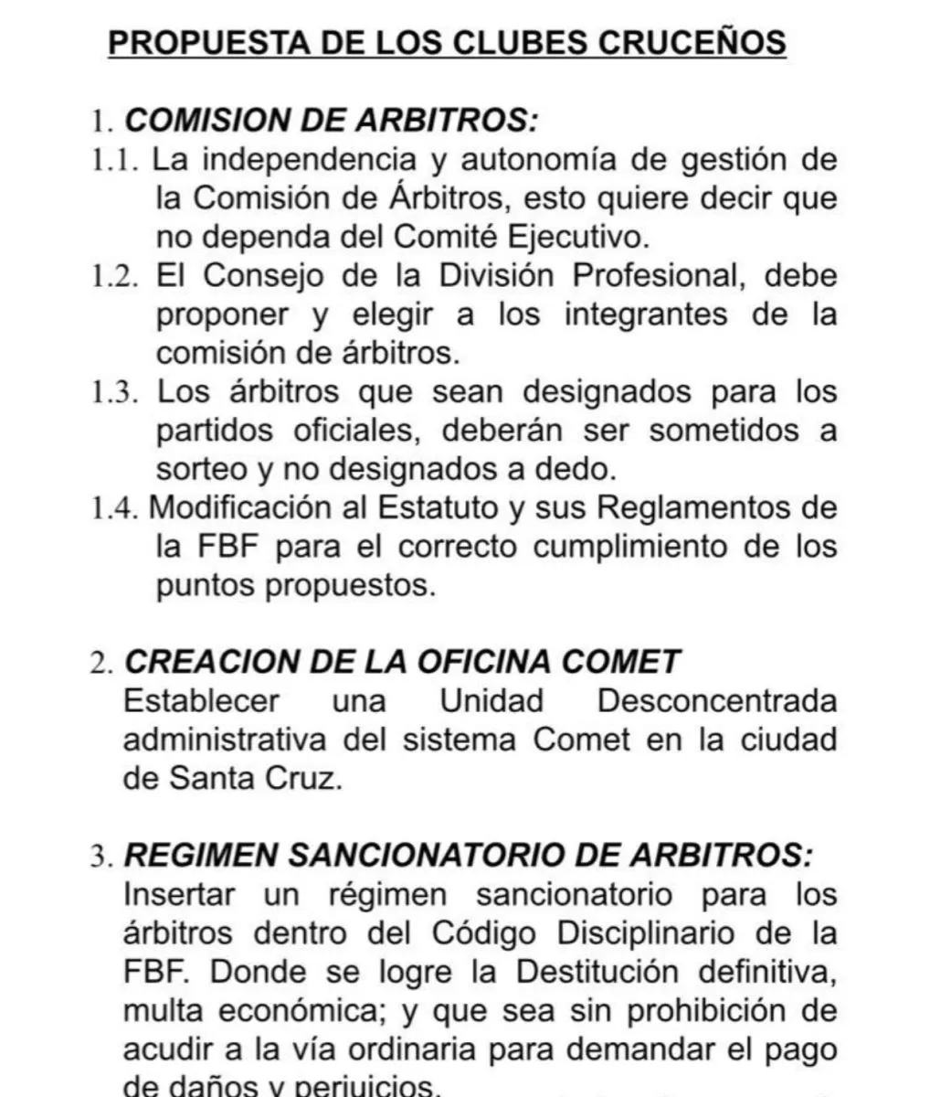 Los seis puntos que exigen son los siguientes: que se establezca independencia de Comisión de Árbitros, la creación de una Oficina Comet en Santa Cruz, un Régimen Sancionatorio de Árbitros, celeridad en procesos del Tribunal de Disciplina Deportiva (TDD) y que se conozcan las sanciones por amaño de partidos denunciadas en 2023.