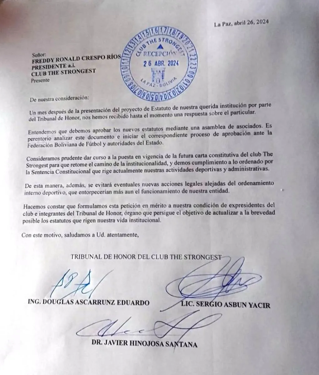 “Entendemos que debemos aprobar los nuevos estatutos en una asamblea de asociados. Es perentorio analizar este documento e iniciar el correspondiente proceso de aprobación ante la FBF y autoridades del estado”, resalta la misiva firmada por Douglas Ascarrunz, Javier Hinojosa y Sergio Asbún.