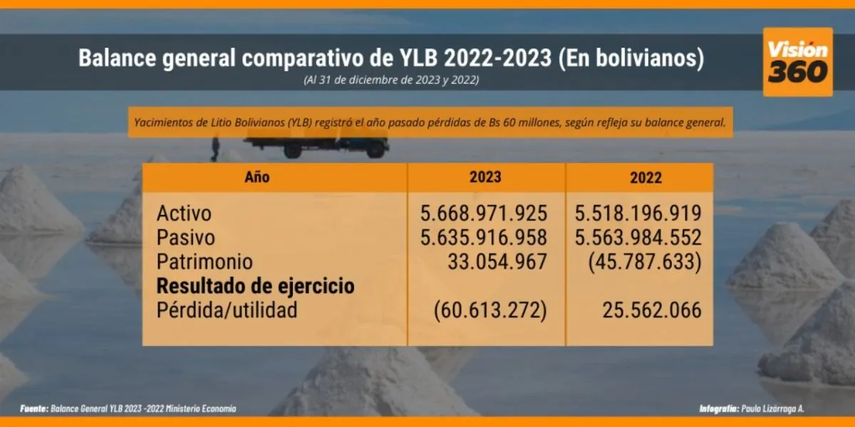 ¿Cómo le va a Yacimientos de Litio Bolivianos (YLB) en términos financieros? La estatal del litio reportó el año pasado pérdidas por 60,6 millones de bolivianos (Bs 60.613.272), debido a menores ingresos, según revela su Balance General y Estado de Recursos y Gastos Corrientes 2023, reportado al Ministerio de Economía.