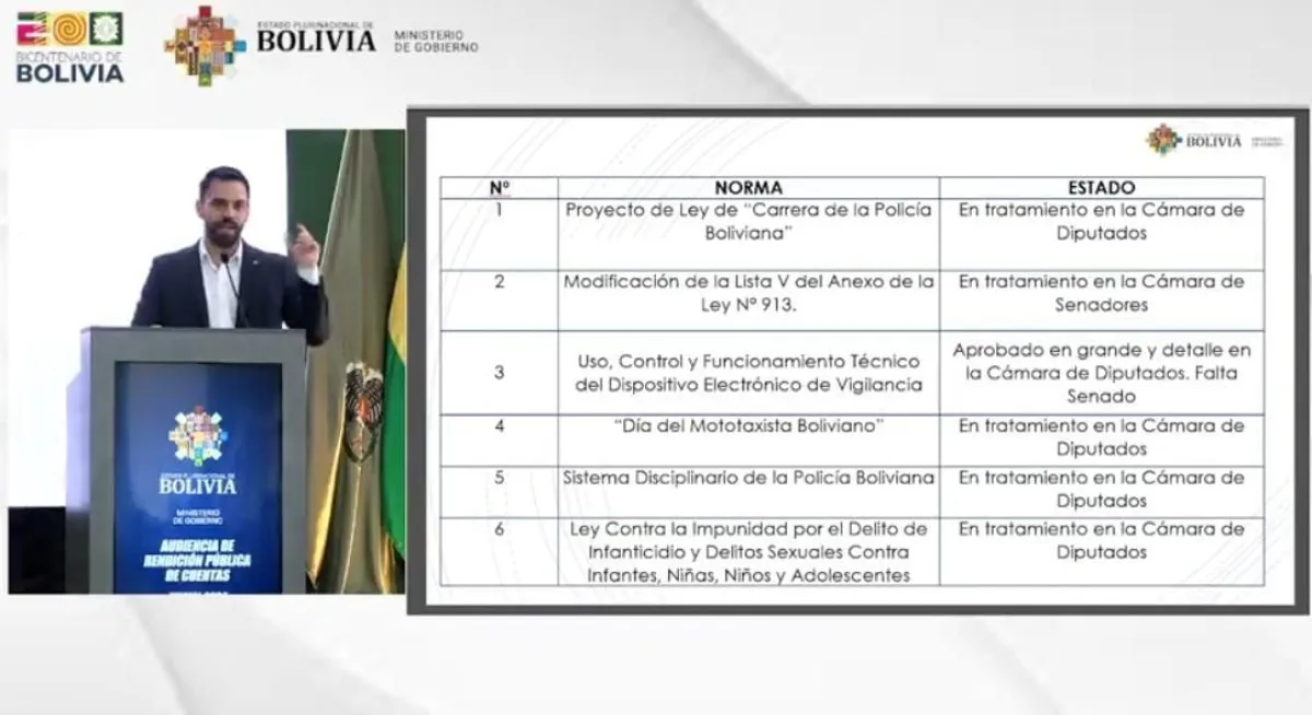 Los otros proyectos paralizados son el de la carrera de la Policía Boliviana (postergado por más de dos años); el de uso, control y funcionamiento técnico del dispositivo electrónico de vigilancia; el del sistema disciplinario de la Policía Boliviana; el del “Día del mototaxista boliviano” y el de lucha contra la impunidad por el delito de infanticidio y delitos sexuales contra infantes, niñas, niños y adolescentes