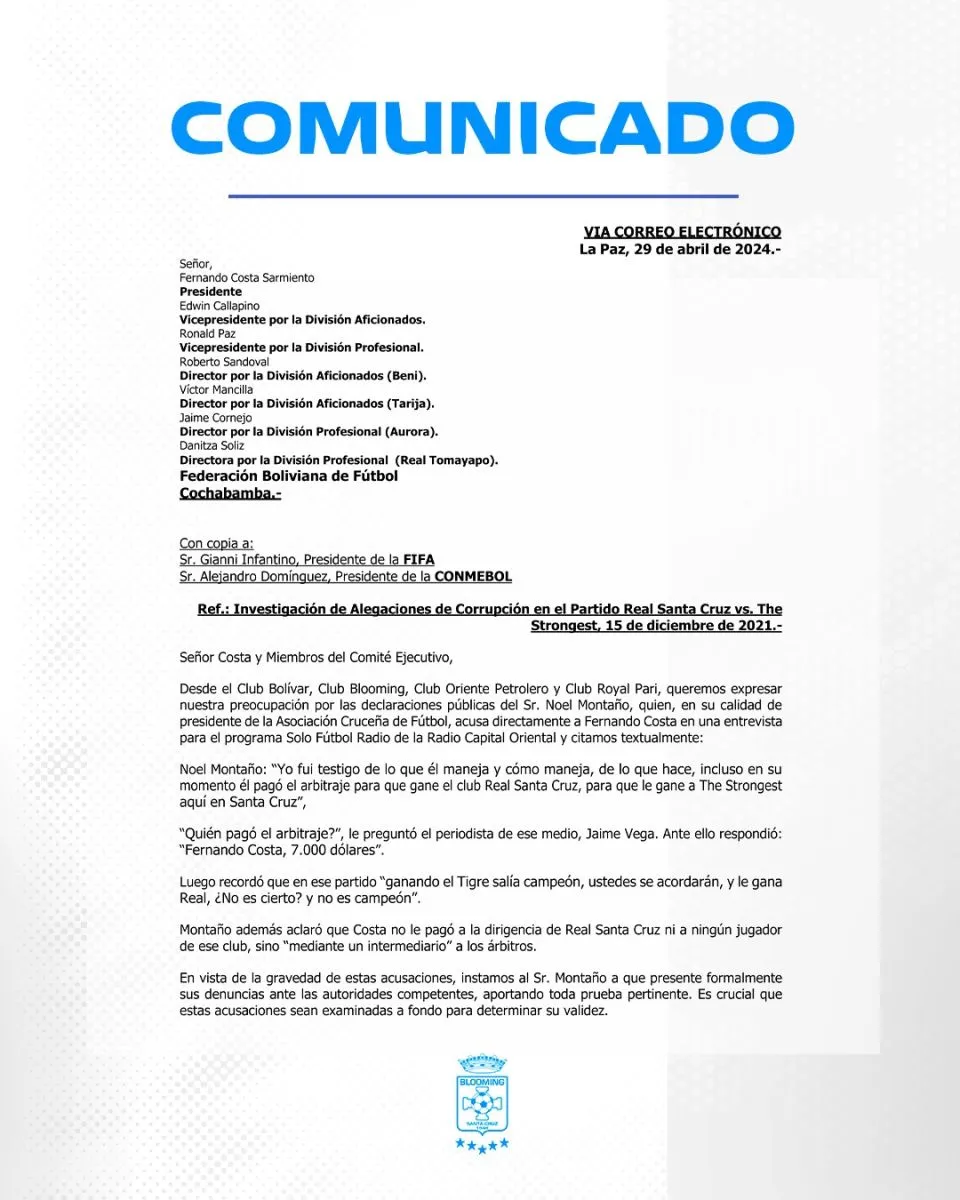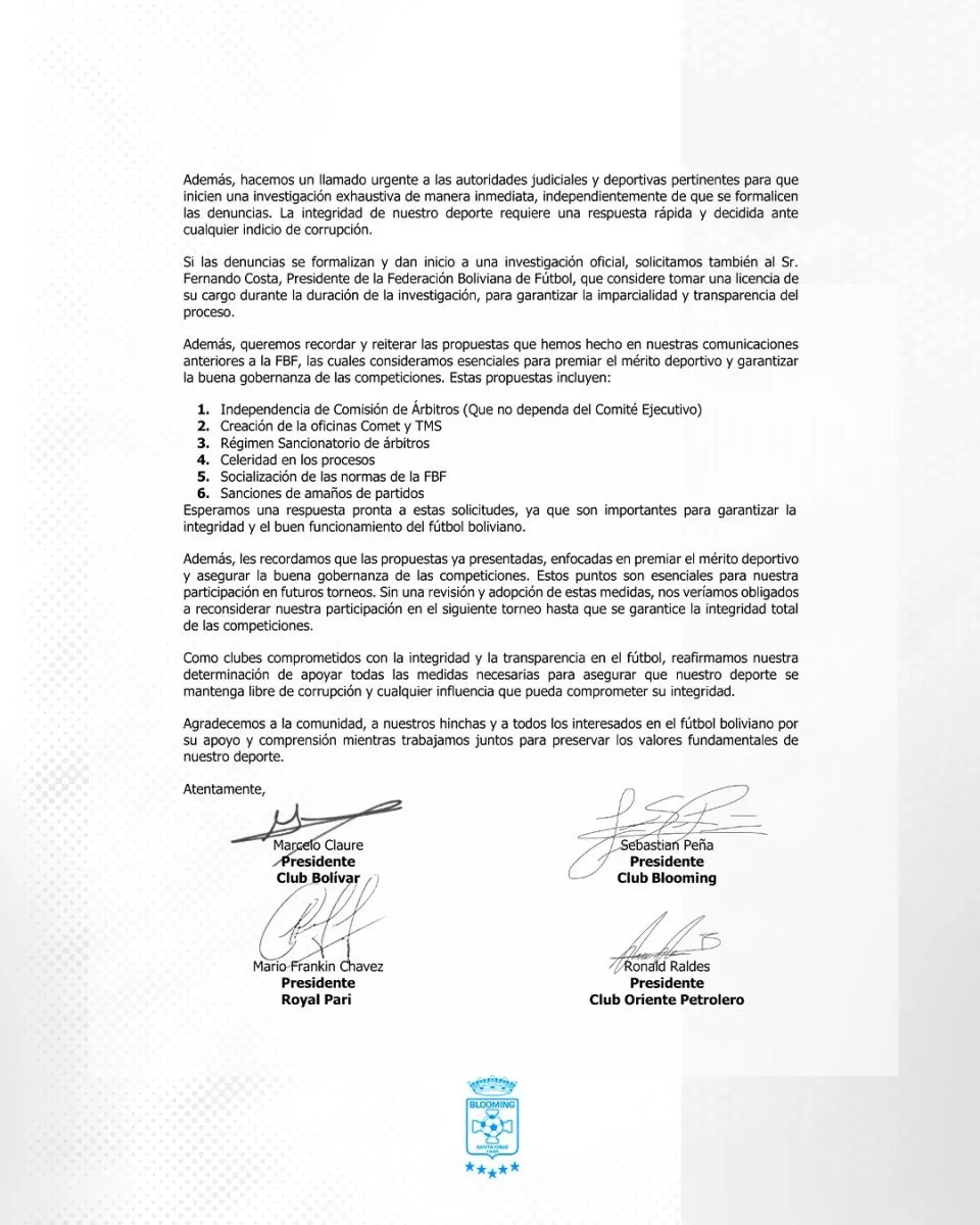 Cuatro clubes de la División Profesional: Bolívar, Oriente Petrolero, Blooming y Royal Pari remitieron una carta al presidente de la Federación Boliviana de Fútbol (FBF), Fernando Costa, y a su Comité Ejecutivo en la que solicitan iniciar una investigación a una supuesta corrupción en el partido Real Santa Cruz vs. The Strongest, correspondiente a la última jornada del Torneo Apertura 2021.