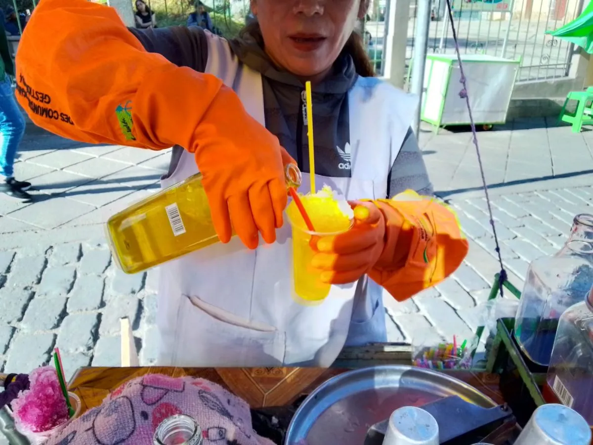 Canaviri agrega el jarabe de mango a un raspadillo.  Foto: Jorge Soruco/Visión360