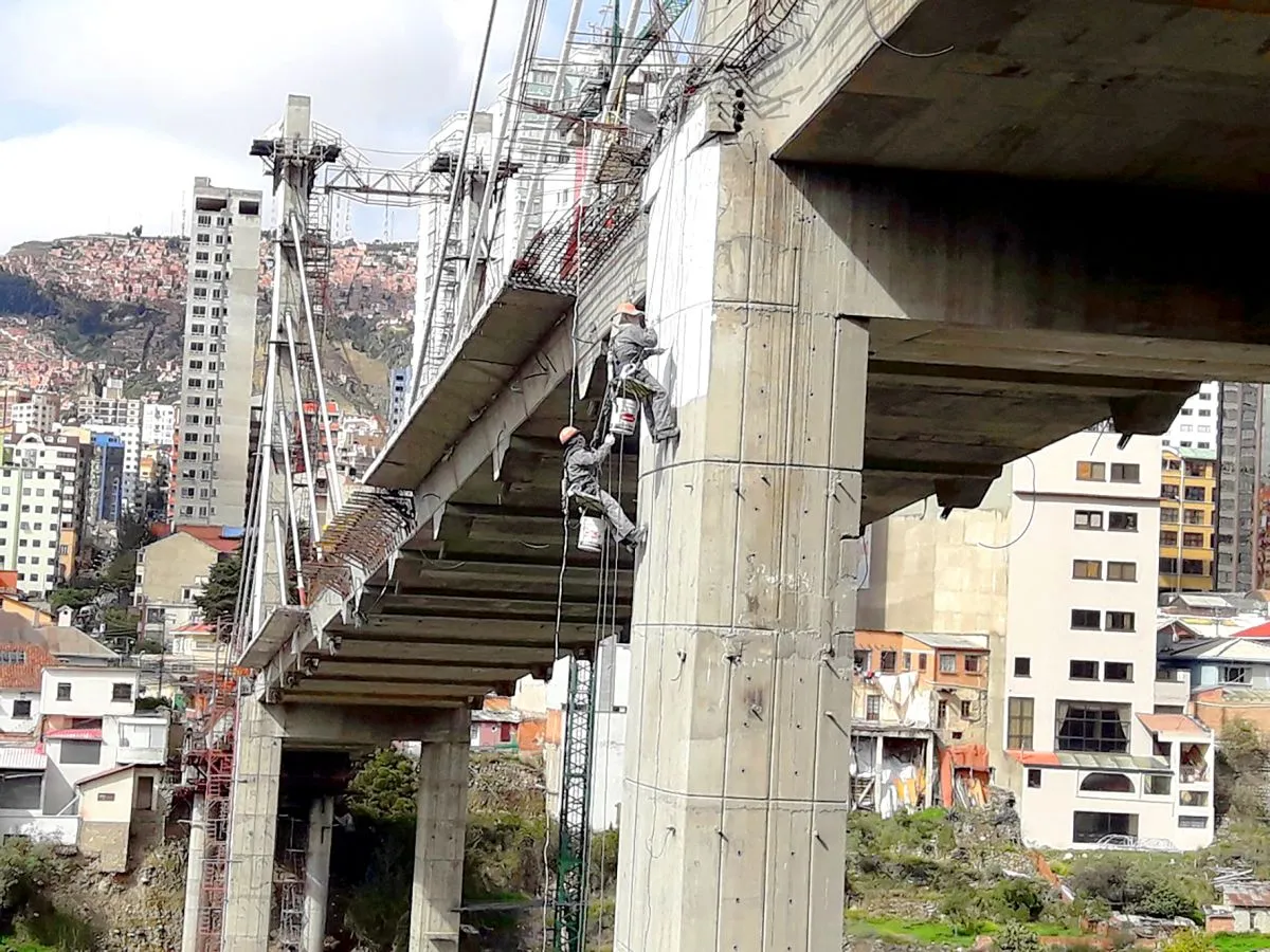 Obreros trabajan en la construcción de un puente. Foto: Miguel Portugal