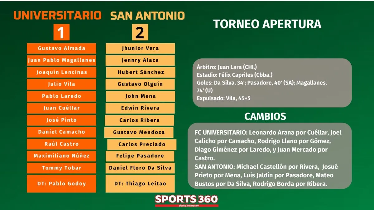 El triunfo lo selló en el primer tiempo en el que llegaron las dos conquistas. Fue cuando San Antonio borró de la cancha a Universitario, manejó la pelota, no le dejó reaccionar y le aplicó los goles.