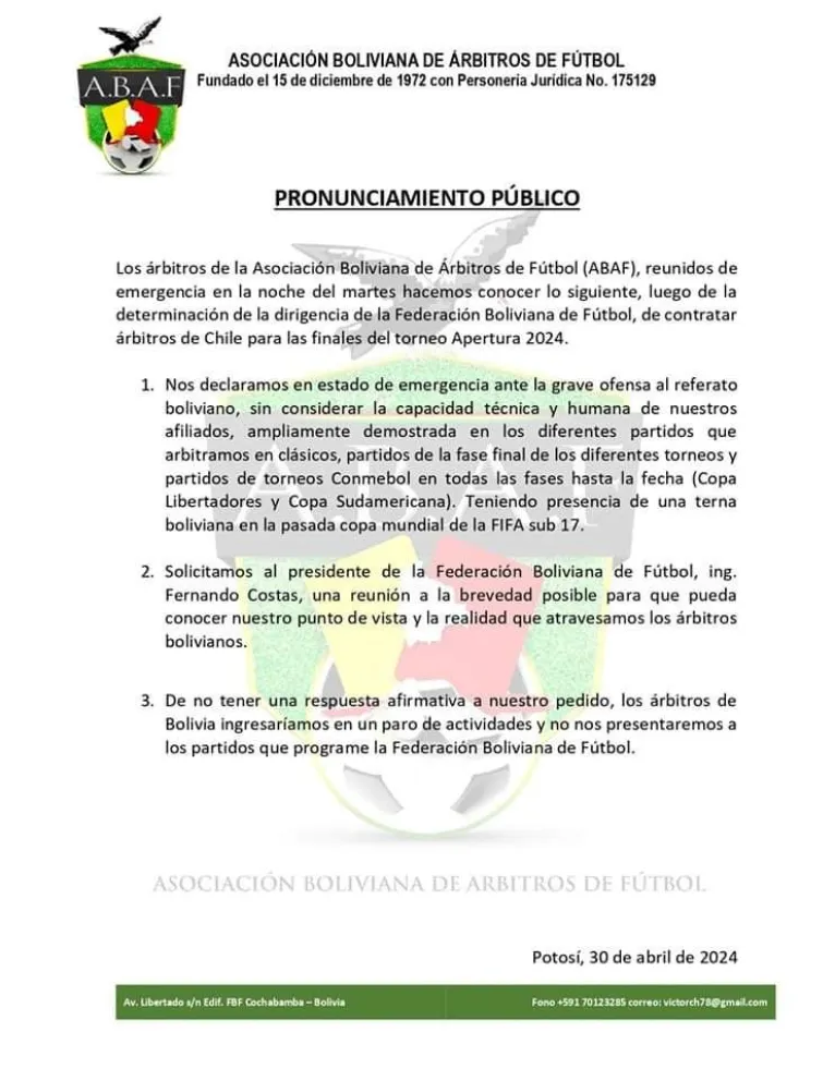Después de que la Federación Boliviana de Fútbol (FBF) decidió contratar árbitros chilenos, los afiliados a la ABAF se reunieron de emergencia la noche del martes y emitieron un pronunciamiento público de tres puntos.