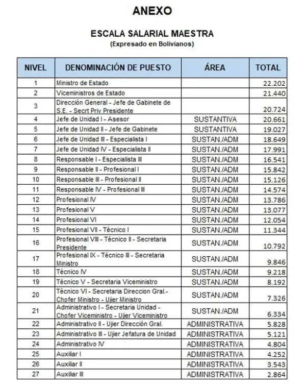 Conforme a los anexos de la norma, el salario de los ministros sube a 22.202 bolivianos, mientras que para los viceministros el sueldo llegará a 21.440. Para los directores y asesores jefes de Unidad el pago será de más de 20.724 y 20.661 bolivianos.