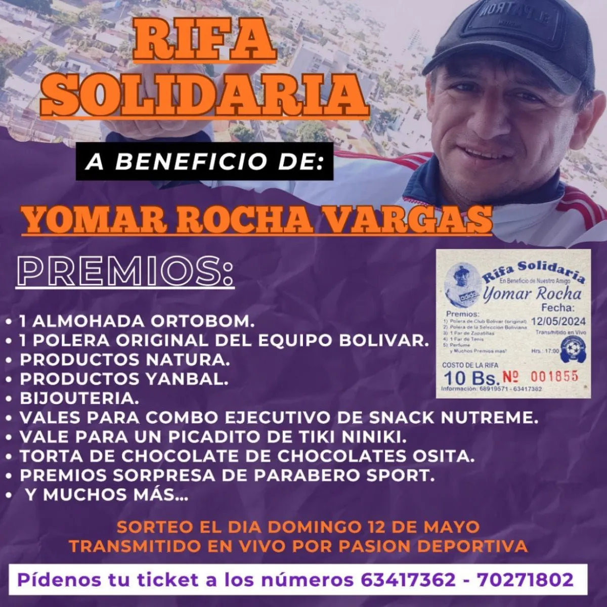 El exfutbolista boliviano Yomar Rocha Vargas se encuentra delicado de salud y por ello sus familiares, encabezados por su hijo del mismo nombre, realizarán una rifa solidaria el domingo 12 de mayo en Beni y que será transmitida en vivo por las redes sociales.