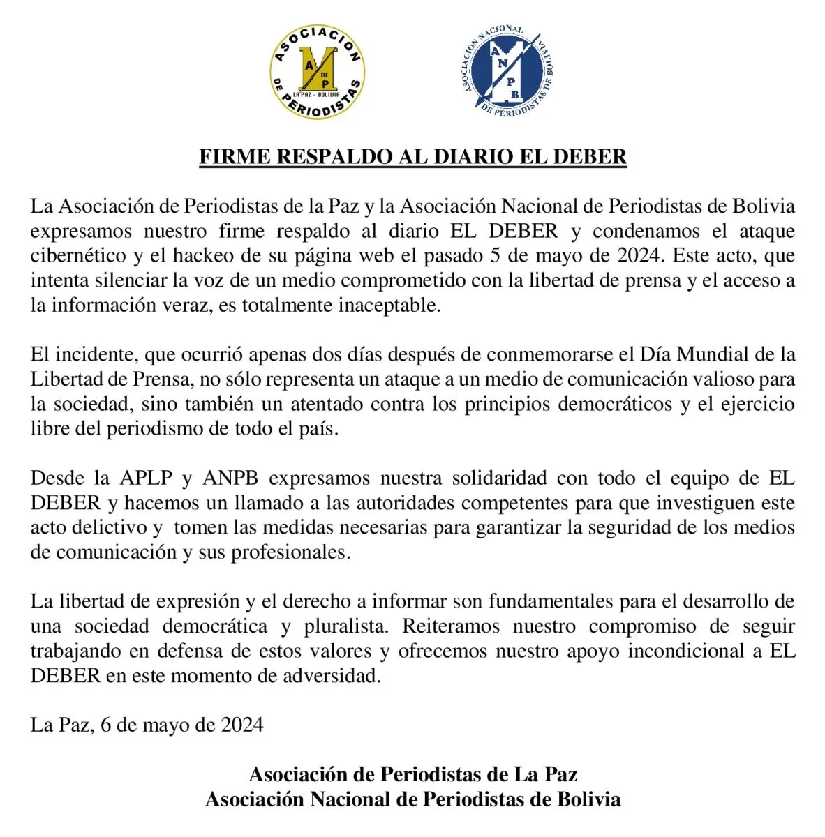 La Asociación de Periodistas de la Paz y la Asociación Nacional de Periodistas de Bolivia (APLP y ANPB respectivamente) expresaron este lunes su condena al ataque cibernético y hackeo a la página web de El Deber de Santa Cruz, que ocurrió el pasado 5 de mayo.
