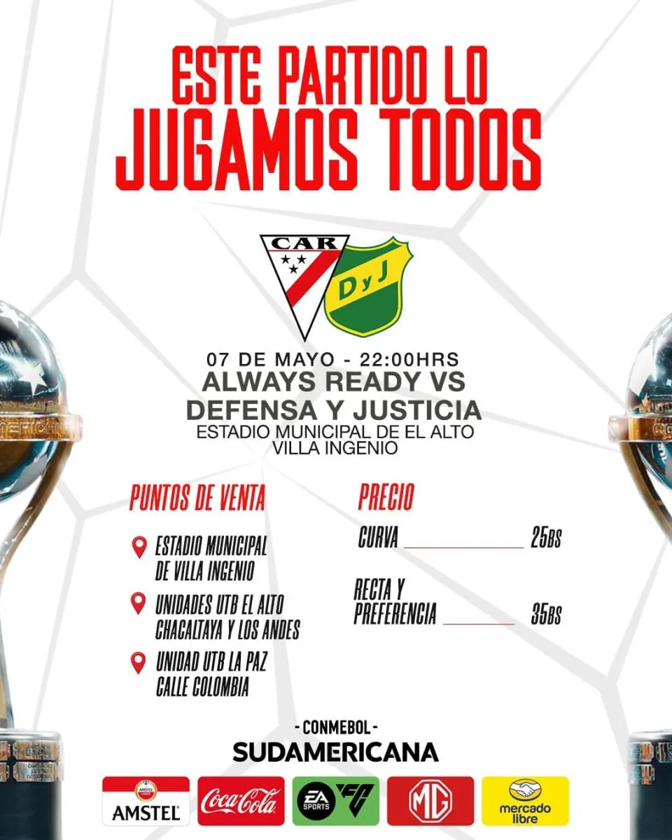 Always Ready saldrá al todo o nada esta noche ante Defensa y Justicia, al que recibirá desde las 22.00 en el estadio Municipal de Villa Ingenio, en lance donde si consigue la victoria se consolidará en el liderato en solitario de la serie A de la Copa Sudamericana.