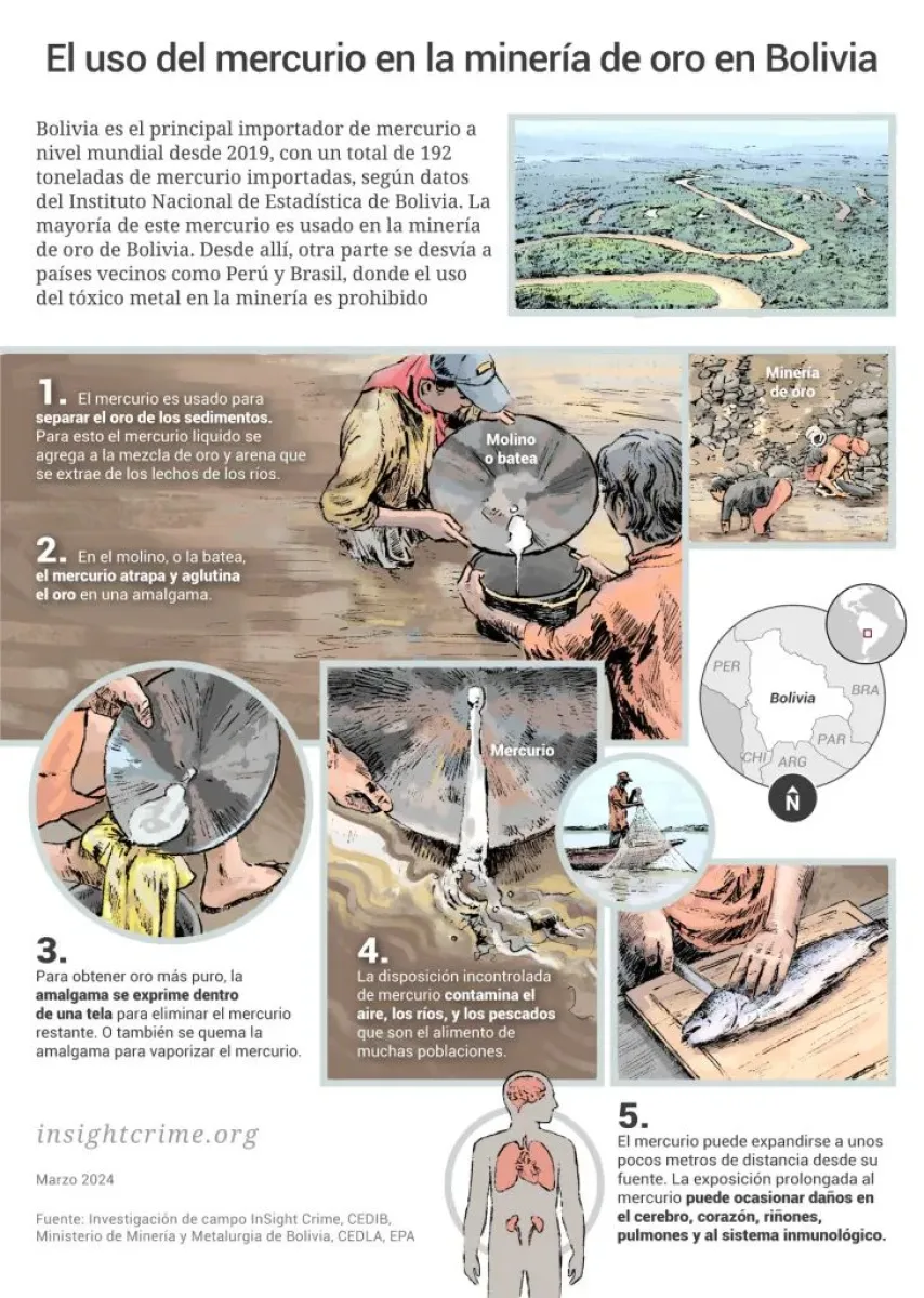 “El mercurio, utilizado por los mineros para extraer oro del suelo y los sedimentos, se introduce a diario de contrabando en botellas a través de las fronteras de Bolivia con Perú y Brasil, llegando a numerosos puntos de minería ilegal a través de la cuenca amazónica”, señala el informe* publicado el 2 de marzo por la revista InSight Crime y del Instituto Igarapé.