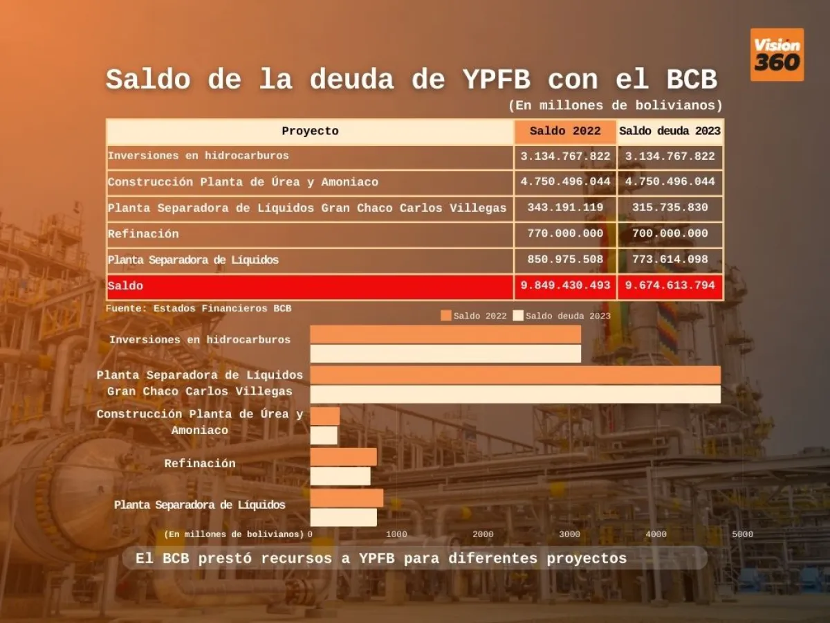El saldo de la deuda de Yacimientos Petrolíferos Fiscales Bolivianos (YPFB) con el Banco Central de Bolivia (BCB), asciende aún a 9.674,6 millones de bolivianos a 2023. ¿En que invirtió la estatal petrolera los recursos? Están diferentes proyectos como la planta de Amoníaco y Urea, entre otros.