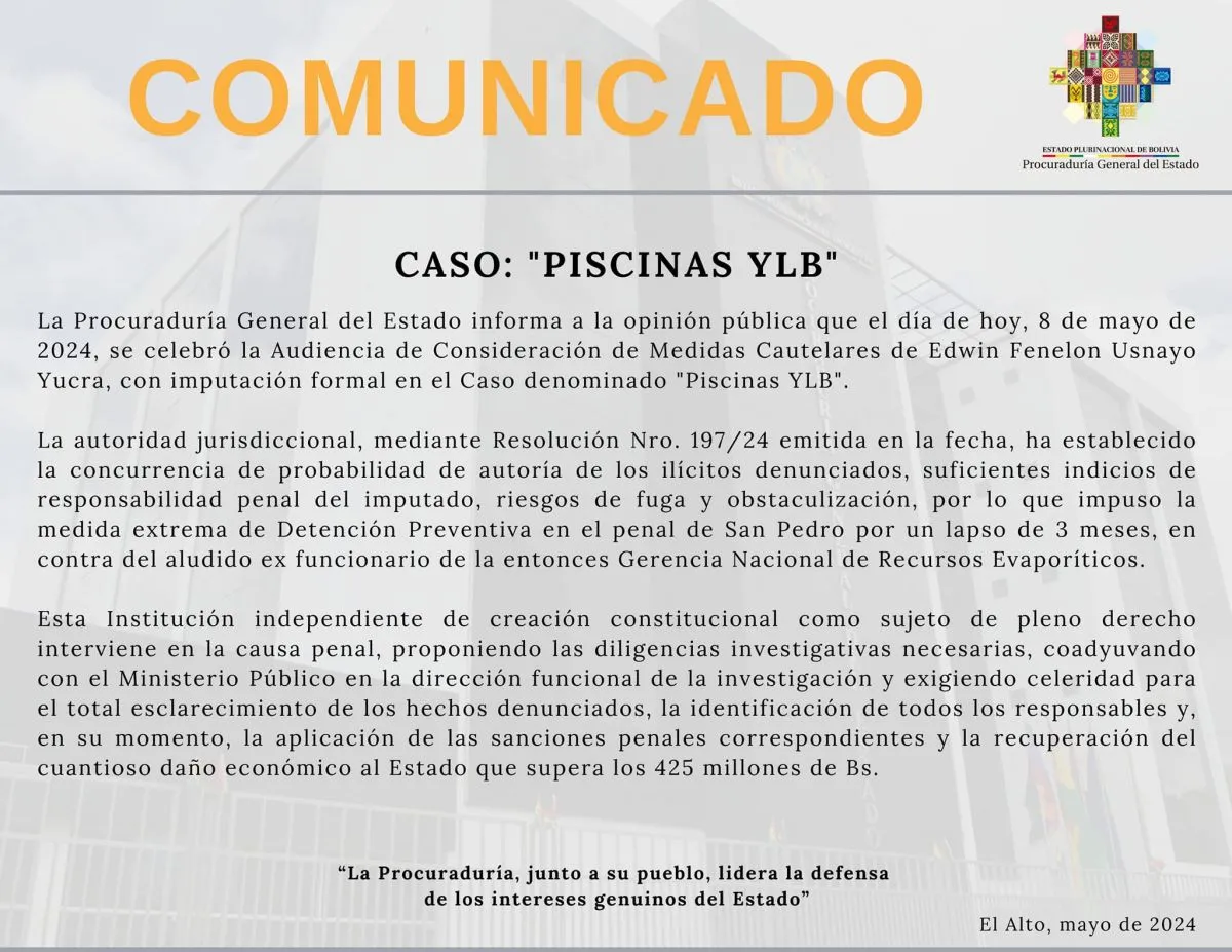 “La autoridad jurisdiccional ha establecido la concurrencia de probabilidad de autoría de los ilícitos denunciados, suficientes indicios de responsabilidad penal del imputado, riesgos de fuga y obstaculización por lo que impuso la medida extrema de detención preventiva”, señala el comunicado de la entidad estatal.