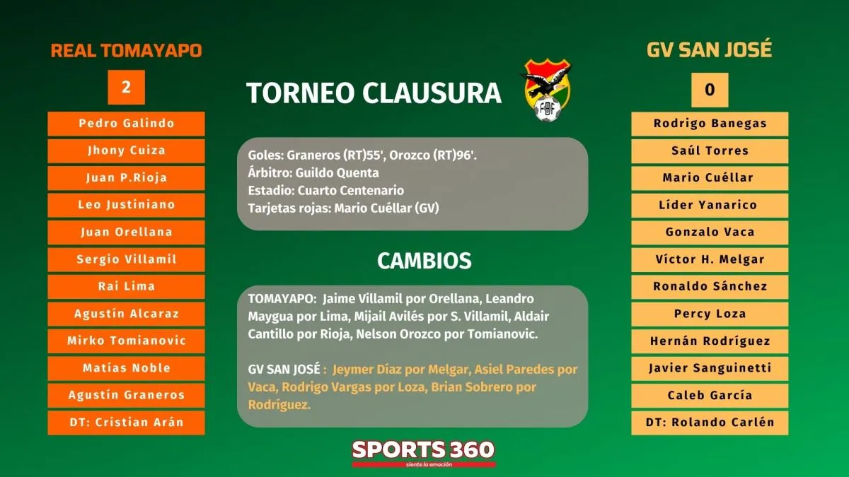 Real Tomayapo inició su campaña en el torneo Clausura con un merecido triunfo sobre GV San José por 2-0, en lance disputado esta noche en el estadio Cuarto Centenario donde hizo prevalecer su localía ante un tozudo rival.