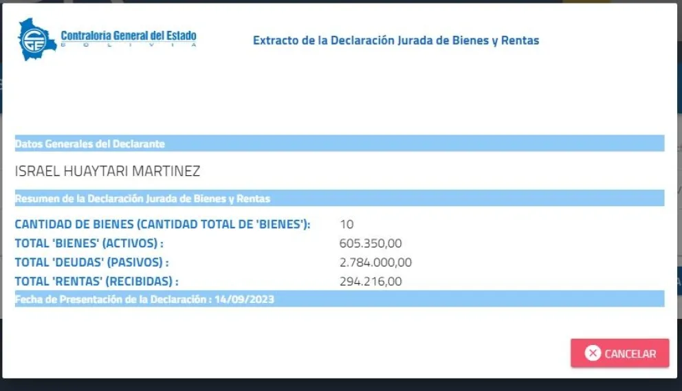 Según la declaración jurada que Huaytari presentó ante la Contraloría General del Estado (CGE), en septiembre de 2023, este sería propietario de 10 bienes, Asimismo, el registro de la CGE detalla que el diputado arcista, representante de Potosí, tiene un total de 605.350 bolivianos en activos; 2,4 millones por deudas y 294.216 de rentas, revelando jugosos ingresos.