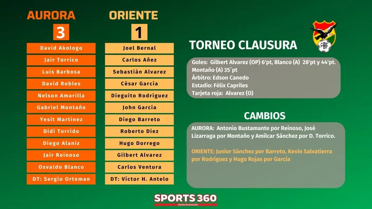 Aurora no tuvo problemas en derrotar esta noche a Oriente Petrolero por 3-1 en partido que se jugó en el estadio Félix Capriles. Pese a que la visita se puso en ventaja, no pudo sostener el ritmo del partido y cosechó su primera derrota en el torneo Clausura.