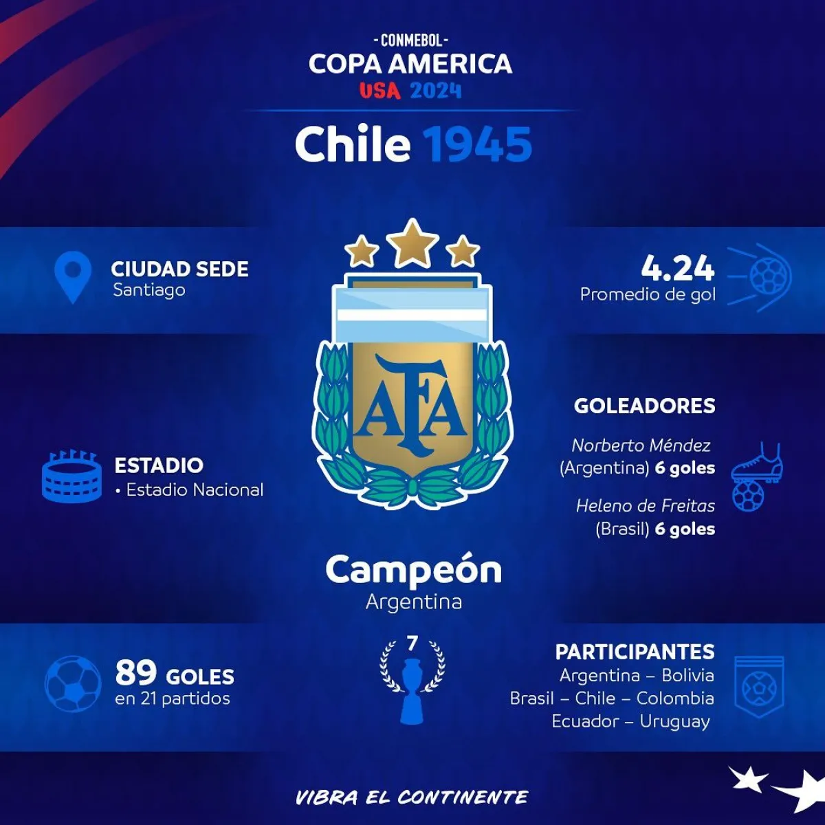 La Copa América de 1945 se desarrolló entre el 14 de enero y el 28 de febrero en Chile. En aquel certamen dijeron presentes Argentina, Brasil, Colombia (primera participación), Uruguay, Bolivia, Chile y Ecuador. Con grandes actuaciones y un extraordinario poderío ofensivo, la Albiceleste obtuvo el certamen de punta a punta.