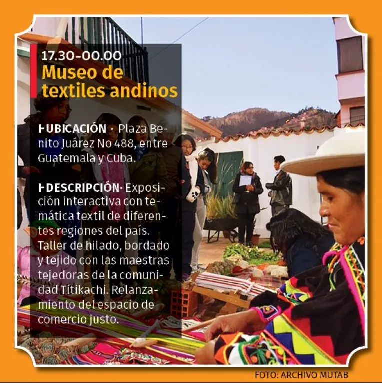 Como parte de la oferta miraflorina, está el Museo de Textiles Andinos Bolivianos. Los asistentes podrán aprender a realizar un tejido desde el proceso mismo del hilado. Las maestras serán las tejedoras de la comunidad Titikachi, de la provincia Muñecas de La Paz.