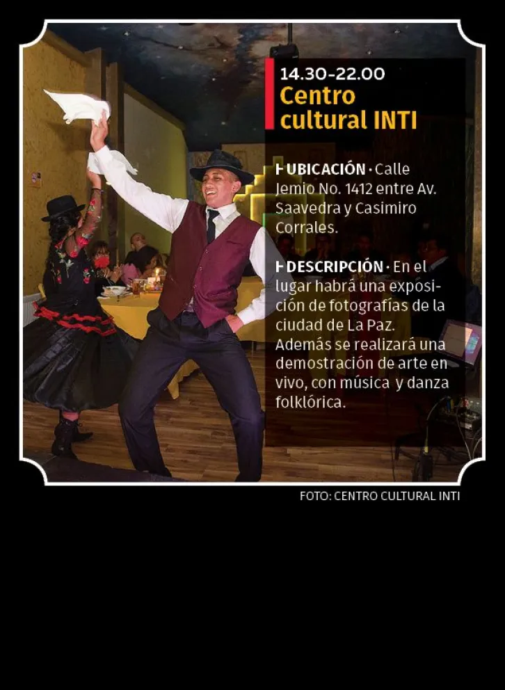 "Participación de las carreras": Los estudiantes de esta casa  de estudios superiores ofrecerán una noche cultural a los asistentes. Habrá exposiciones, música  en vivo y danzas folklóricas representativas de las diferentes regiones de Bolivia, a cargo de sus elencos.