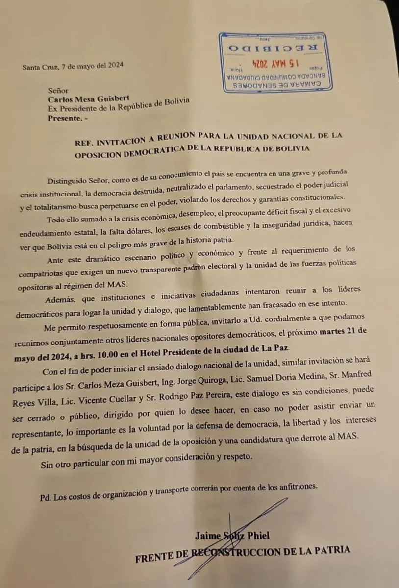 “Invitación a la reunión para la unidad nacional de la oposición democrática de la república de Bolivia”, señala el encabezado de la carta enviada a los diferentes actores políticos, para que asistan a un encuentro programado para el día 21 de mayo, en la ciudad de La Paz. El objetivo sería frenar el monopolio del Movimiento al Socialismo (MAS) en el Gobierno.