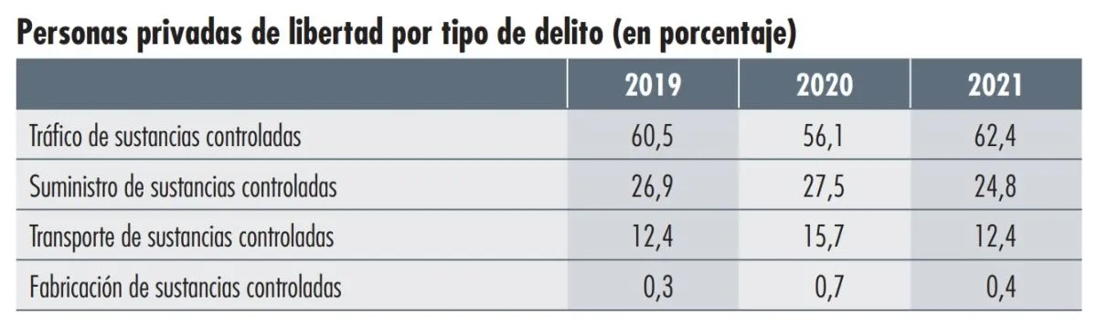 De acuerdo con datos del Observatorio Boliviano de Seguridad Ciudadana y Lucha Contra las Drogas (OBSCD), en 2021, el 62,4% de los privados de libertad estaban en la cárcel por tráfico de sustancias controladas, el 24,8% por suministro de sustancias controladas, el 12,4% por transporte de sustancias controladas y el 0,4% por fabricación de sustancias controladas.