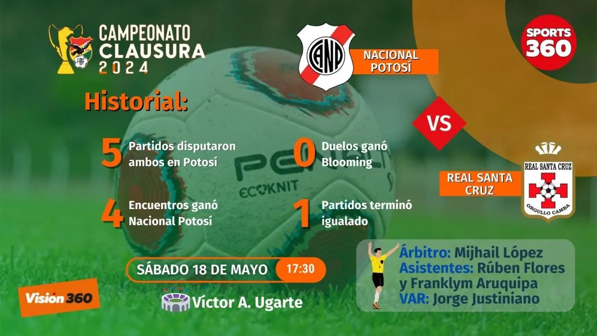 El segundo partido de este sábado lo protagonizarán Nacional Potosí y Real Santa Cruz, que se enfrentarán desde las 17.30 en el estado Víctor Agustín Ugarte, de la Villa Imperial.
